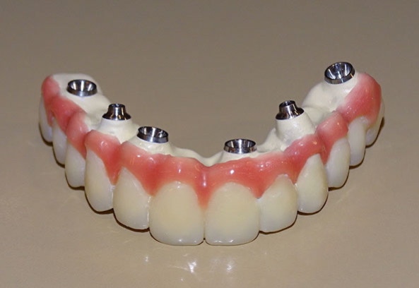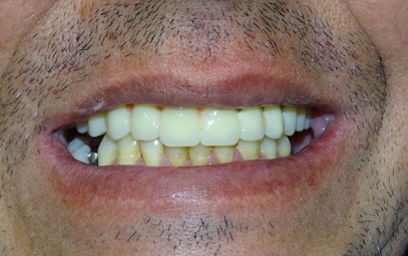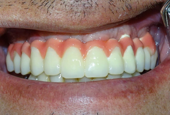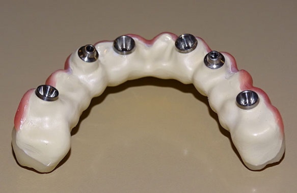 Tratamiento con prótesis fija sobre 6 implantes Nobel Biocare: 4 Multi-Unit y 2 Nobel Replace Conical Connection plataforma NP.