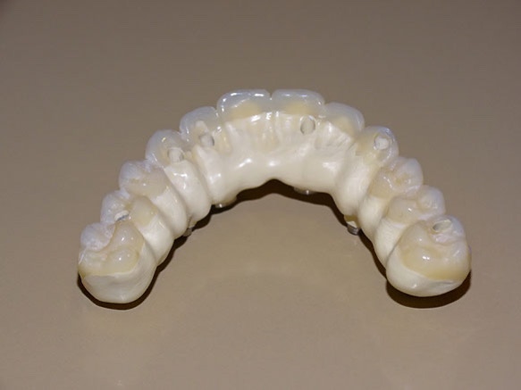 Escaneados con Scan Bodies con sistema Zirkonzahn. Interfases Zirkonzahn cementadas con Ivoclar Multilink Hybrid Abutment previo tratamiento de arenado y primer del PEEK color dentina.