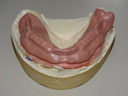 PEEK híbrido con tres coloraciones: blanco, encía y dentina.